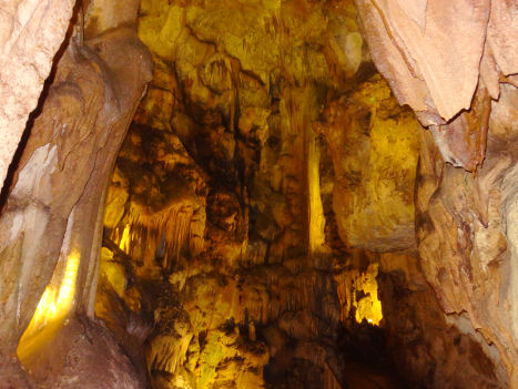 Les galeries aménagées se divisent en deux ensembles que l'on parcourt successivement ; l'escalier d'accès emprunte le grand aven qui résulte d'un effondrement de la voûte. La première partie, contient de très belles draperies en forme de méduses, d'une grande richesse de coloris. La seconde partie, riche en stalactites et stalagmites, présente également une forêt d'aiguilles pendant du plafond. Dans la dernière salle, des fouilles sont en cours afin de dégager des ossements préhistoriques.